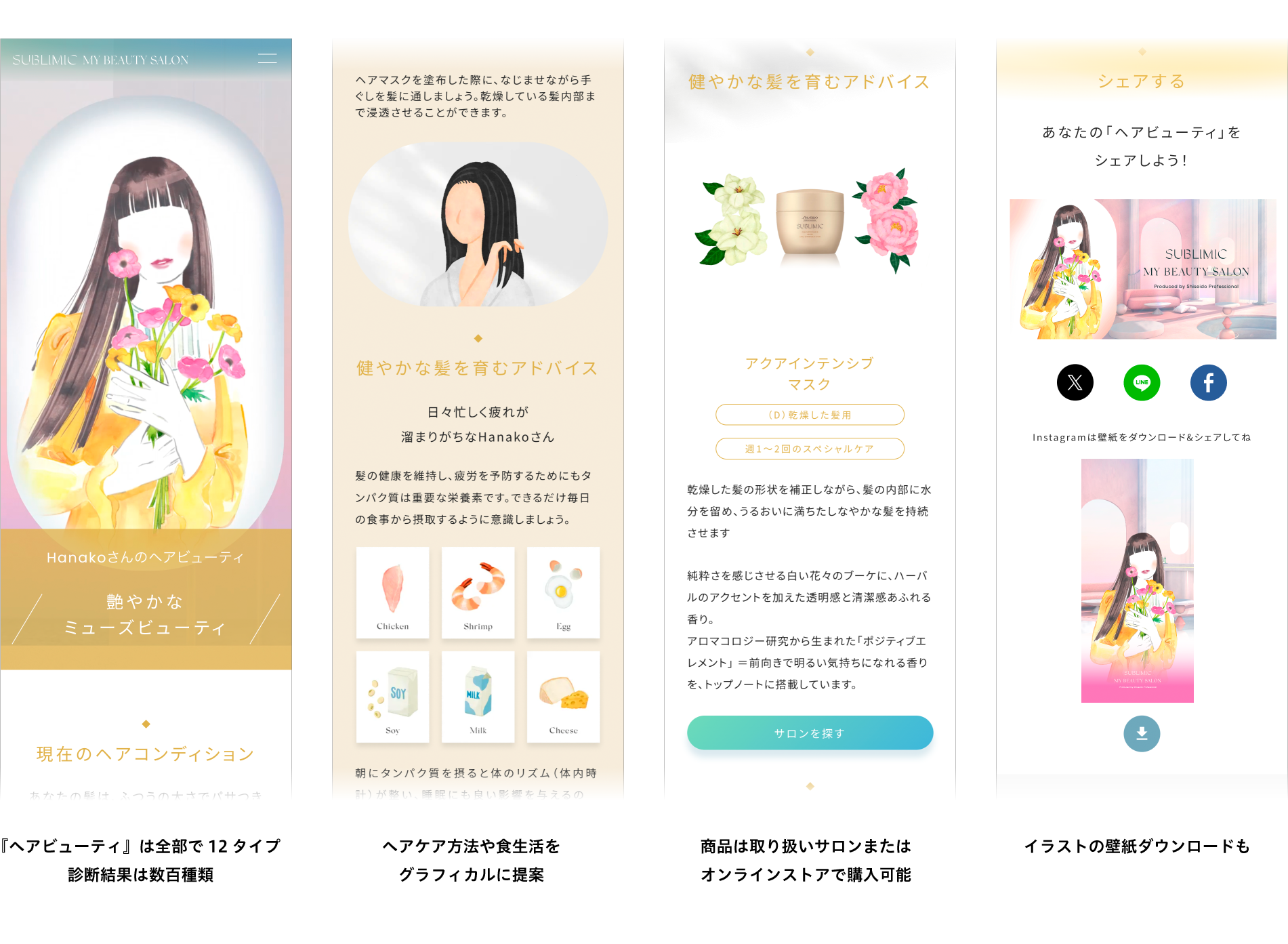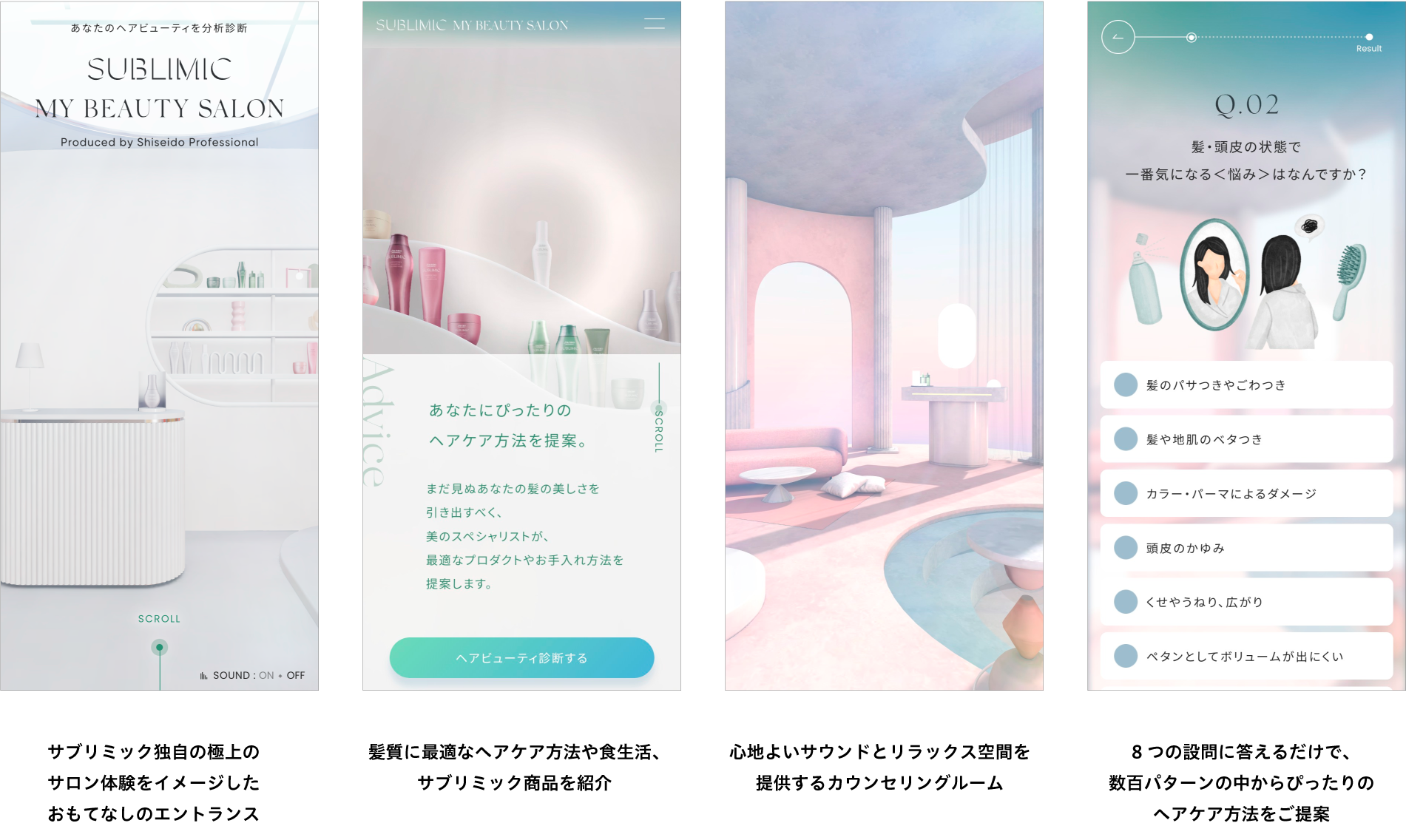 資生堂プロフェッショナルがグローバルに展開するプレミアムヘアケアブランド「SUBLIMIC」のバーチャルプレミアムサロン「SUBLIMIC MY BEAUTY SALON」。髪に眠る美しさの可能性『ヘアビューティ』を、髪の状態やライフスタイルに関する8つの設問から数百パターンに分類してパーソナライズ診断します。SUBLIMICのヘアサロンにいるような極上の体験を通して、おすすめのヘアケア方法や生活習慣を提案するコンテンツです。